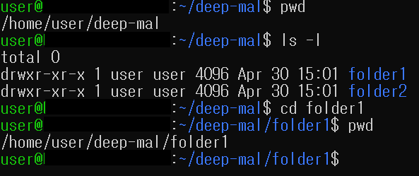 pwd로 현재 위치를 확인하고, cd 명령어를 통해 folder1으로 이동하였습니다.