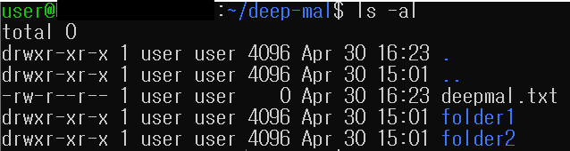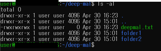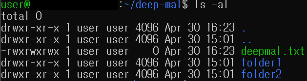 ls -al 명령어를 통해 deepmal.txt 생성, 권한을 확인합니다.