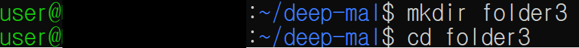 mkdir 명령어로 folder3를 생성한 뒤, cd 명령어로 folder3 디렉토리로 이동합니다.