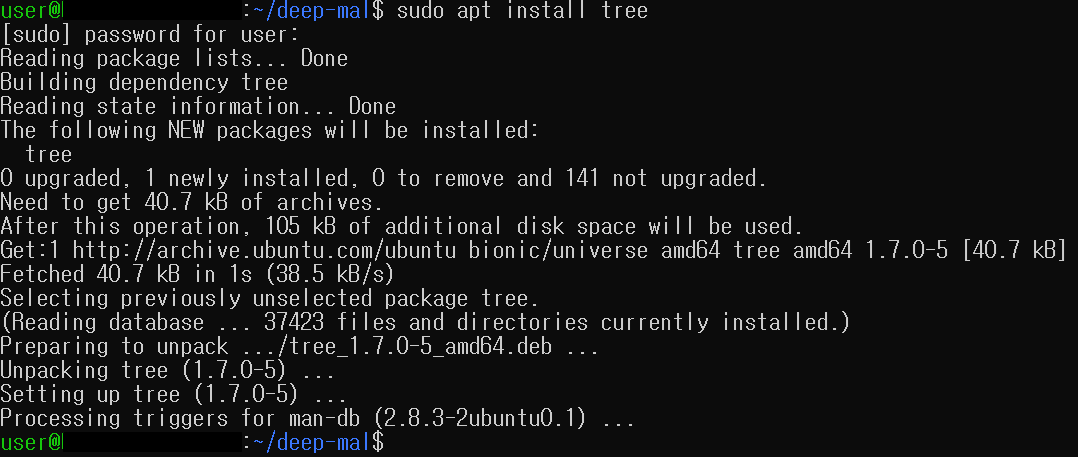 tree 명령어가 작동하지 않는다면, 다음 명령어를 통해 설치합니다.