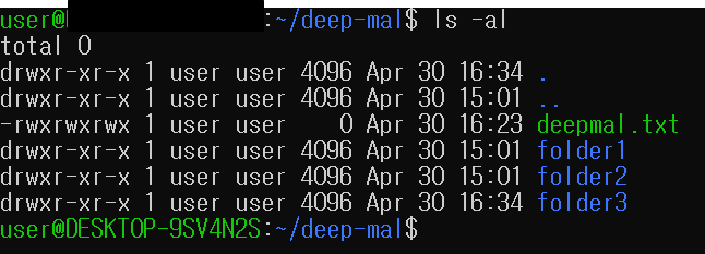 ls -al 명령어를 통해 deepmal.txt 생성, 권한을 확인합니다.