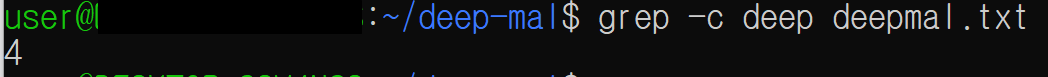 grep 명령어를 통해, deepmal.txt 내 "deep" 문자열을 포함하고 있는 행의 개수를 출력합니다.