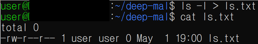ls 명령어를 통해 deepmal.txt가 생성되었음을 확인합니다.