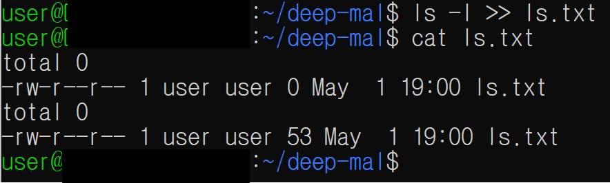 ls.txt 파일에 ls -l의 결과가 이어서 작성되었음을 확인합니다.