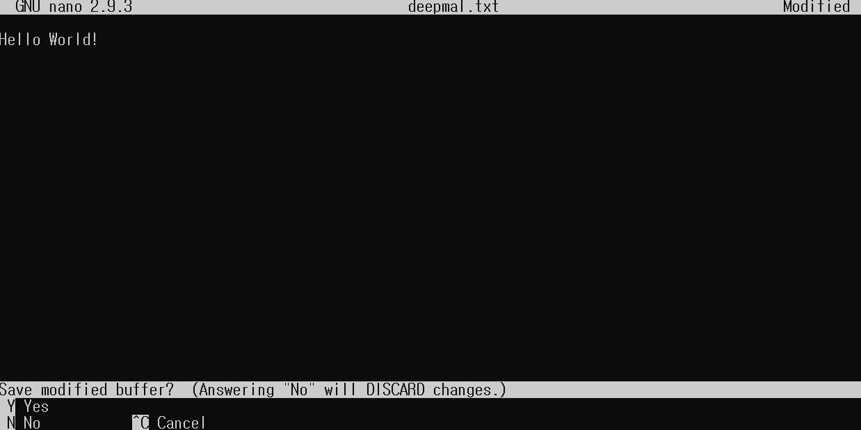 deepmal.txt에 "Hello World!"를 입력 한 뒤, Ctrl + X 를 누릅니다.