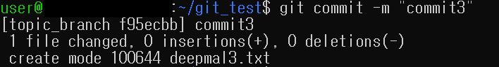 2. deepmal3.txt 파일을 생성한 뒤, commit 수행(commit 메시지: "commit3")ubuntu에서 touch 명령어를 통해 deepmal3.txt 파일을 생성합니다.