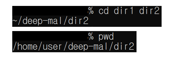 이와 같이 상위 디렉토리 /deep-mal 내, 동일한 hierarchy에 위치한 디렉토리/dir2로 이동할 수 있습니다.