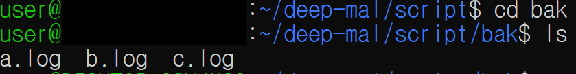 bak 디렉토리로 이동 한 뒤, .log 파일들이 잘 복사되었는지 확인합니다.