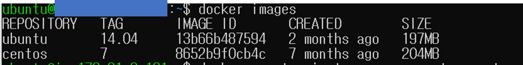 centos:7 이미지와 docker create를 통해 내려받은 ubuntu:14.04 이미지가 존재함을 확인할 수 있습니다.