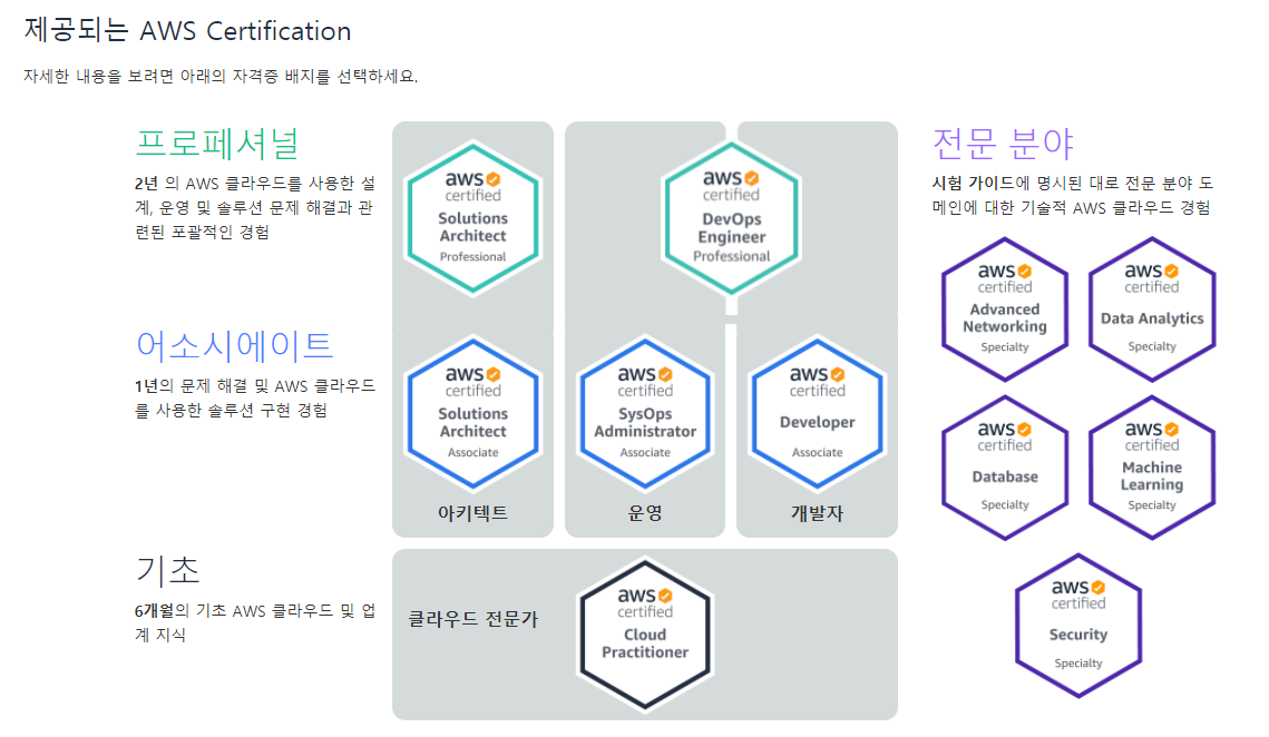 AWS Certification은 기초, 어소시에티트, 프로테셔널, 전문분야의 등급으로 구분됩니다.
