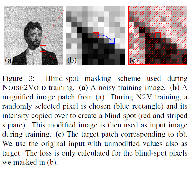 - 만약, 간단히 patch를 입력으로하고, center pixel을 target으로 한다면, 네트워크는input patch의 center를 output으로 직접 mapping하여 단순히 identity를 학습하게 됩니다(Figure 2 a).