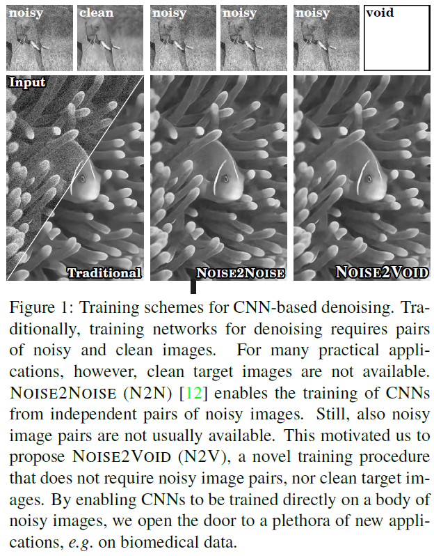 Only single noisy 이미지를 활용하여 denoising CNNs을 훈련하기 위한 방법인 NOISE2VOID를 소개하였습니다.