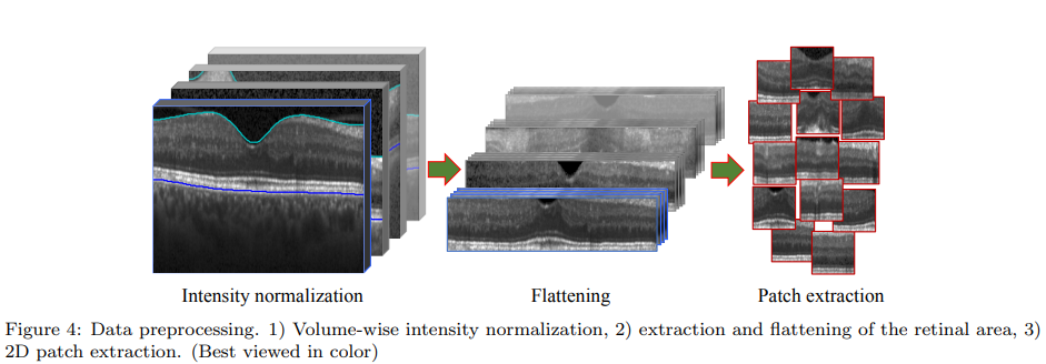 - Figure 4는 OCT 스캔으로 부터 2D iomage patches로의 date preprocessing step의 overview를 보여줍니다.