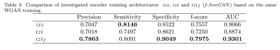 Table 2) 3개 encoder training architecure를 사용하였을 때의 f-AnoGAN의 성능평가