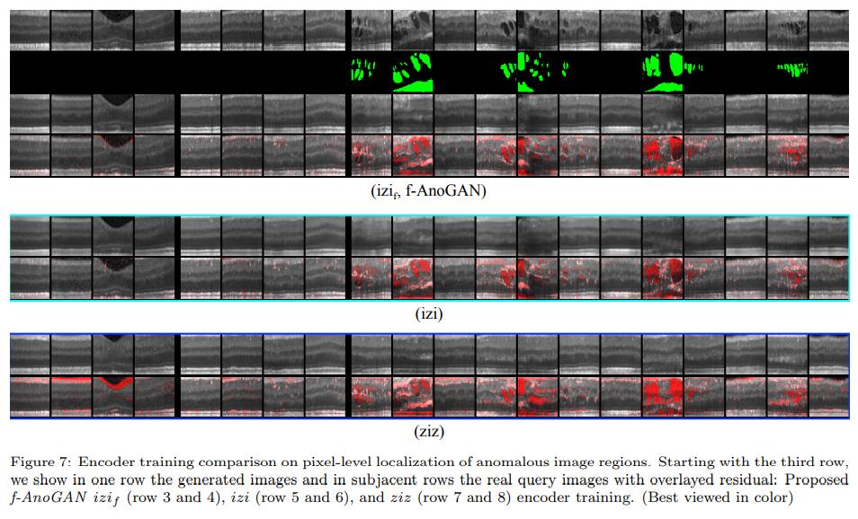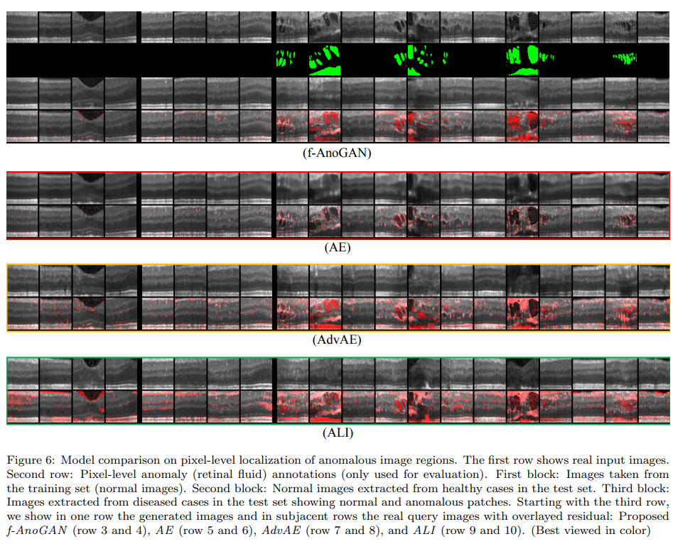 - fourth row: real query images와 f-AnoGAN의 generated images간 overlayed residual