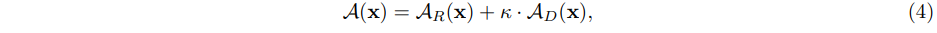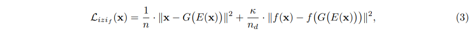 - dissciminator guided izif encoder training(Equation (3))에 기반한 f-AnoGAN 모델은 다음과 같이 정의된 final anomaly score A(x)를 사용합니다.