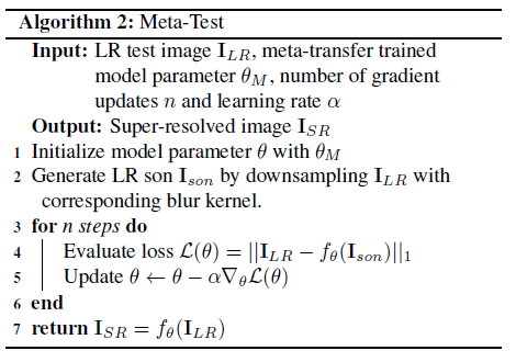 Algorithm 2는 meta-test step(zero-shot super-resolution)을 묘사하고 있습니다.