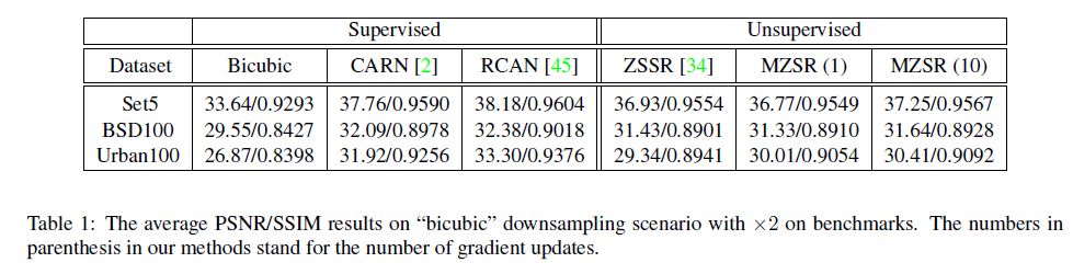 ZSSR과 MZSR은 supervised와 비교하여 좋은 성능을 달성하지 못하였는데, 이는 MZSR과 ZZSR이 unsupervised of self-supervised regime이기 때문입니다.