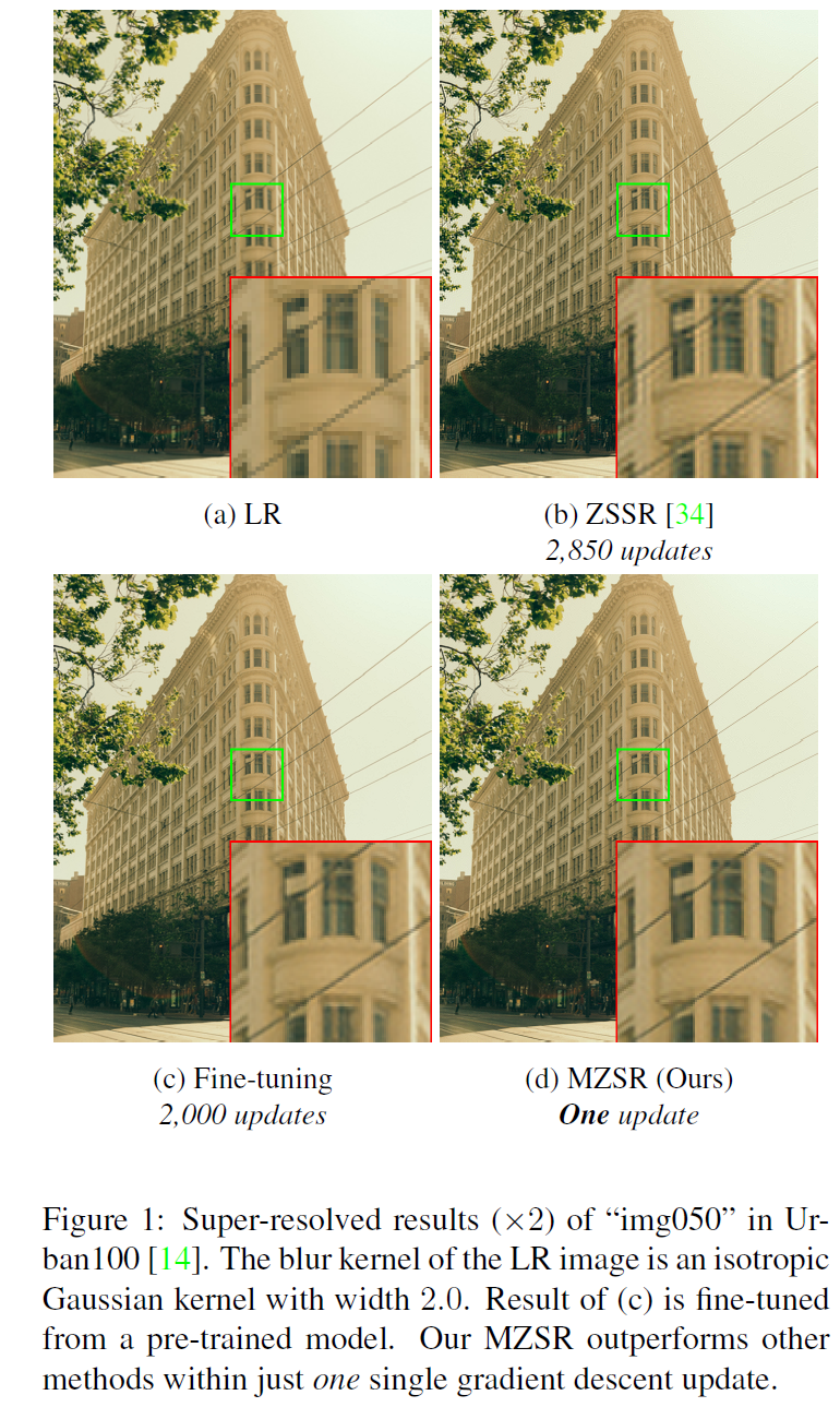 - 즉, MZSR은 external과 internal information을 함께 사용하여, 추론 단계에서 단 한번의 업데이트만 수행하고 quite considerable results를 생성할 수 있습니다.(Figure 1)