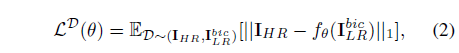 - 그 뒤, 식(2)에 정의되어있는 loss를 최소화 하기 위한 network를 훈련시켜 "bi-cubic" degradation model이 super-resolution을 수행하도록 학습시킵니다.