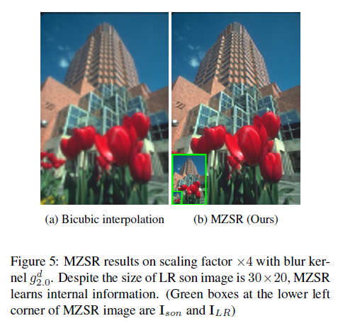 반면, ZSSR은 image specific internal structure를 학습하기 위한 CNN으로 제안되었고, real world scene에 적용될 수 있다는 flexibility가 있는 것을 보여줏었습니다.