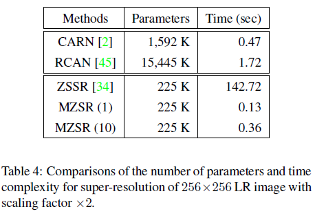 - MZSR은 single gradient update를 사용하면 가장 적은 시간이 소요되며, 10 iterations를 수행한다고 하더라도 CARN과 상응하는 시간만이 소요된다는 장점이 있습니다.