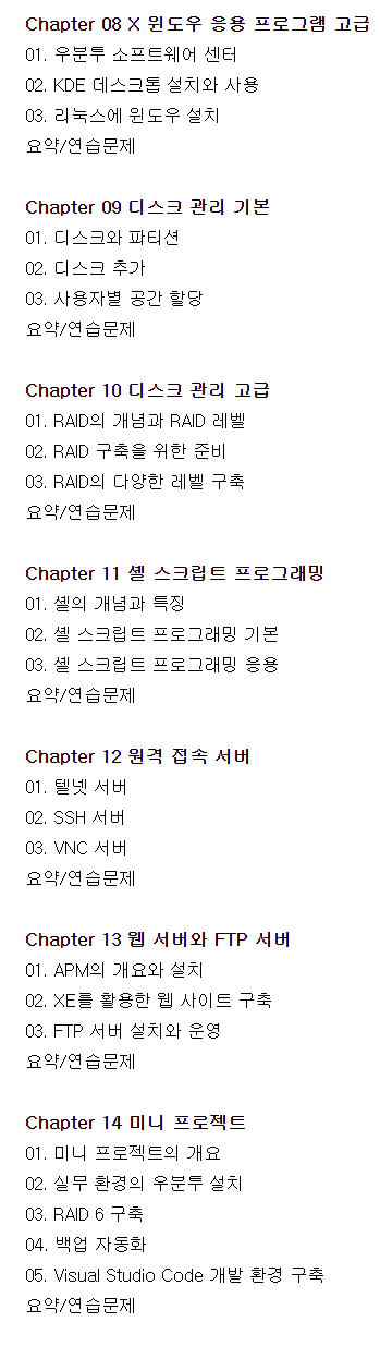 목차는 14개 챕터로 이루어져 있습니다. 마지막 챕터인 14장에서는 미니프로젝트를 통해 실무 환경에 맞는 우분투 서버를 설치하고 RAID 6 구축, 백업 자동화, VSCode 개발 환경 구축으로 이루어져 있습니다. 리눅스의 전반적인 내용으로 목차가 이루어져 있으며, 각 챕터별로 핵심 내용에 대한 실습을 진행할 수 있습니다.