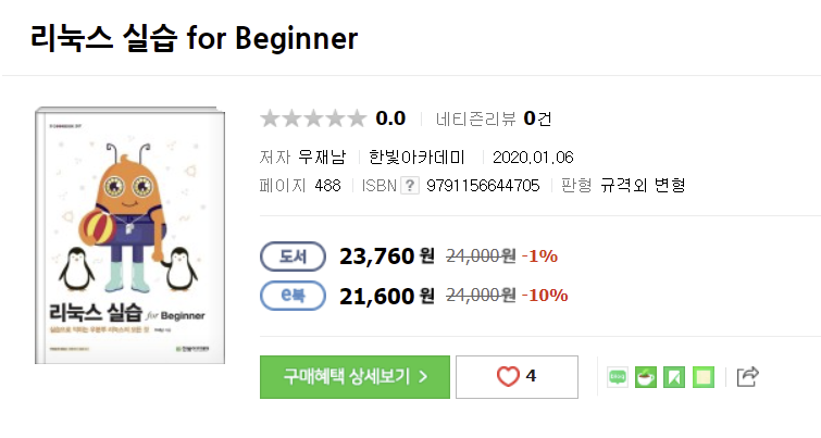리눅스 실습 for Beginner 교재는 한빛아카데미에서 우재남 저자에 의해 2020년 1월에 발간되었고, 488페이지로 다른 리눅스 교재들과 비교하여 다소 얇은 편입니다.