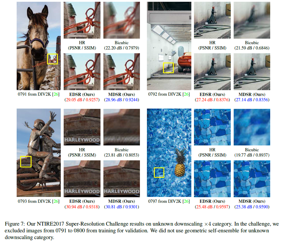 또한 proposed method는 NTIRE 2017 Super-Resolution Challenge에서 각각 1등, 2등을 차지하였습니다.