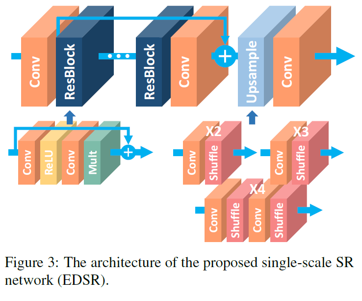 - final single-scale model(EDSR)에서는 baseline model을 확장하여, B=32, F=256, scaling factor 0.1 을 셋팅 하여 Fig. 3과 같이 아키텍처를 구성하였습니다.