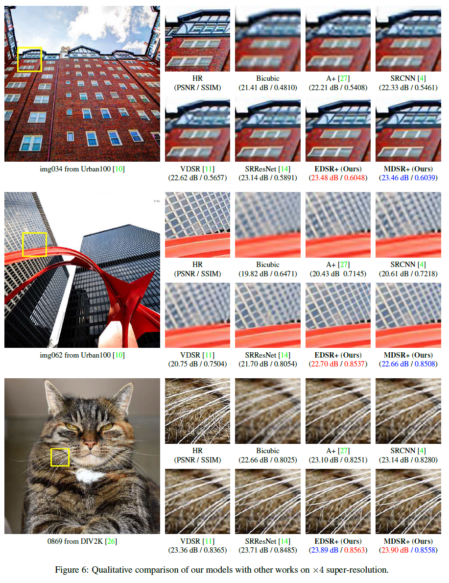 - EDSR, MDSR는 다른 모델들과 비교하여 상당한 성능 향상을 이루어 냈으며, self-ensemble을 수행 했을 때 성능향상이 더 컸습니다.