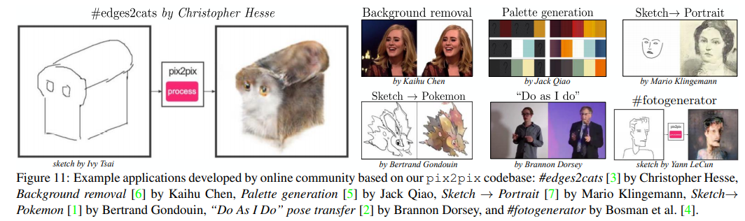 - pix2pix software가 본 논문과 함께 발표된 이후로, 많은 관심을 가져 주었고 다양한 연구자들의 softwafe에 그들의 고유한 실험을 진행하여 범용적인 적용성을 검증 하였습니다.