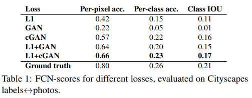 Table 1: FCN-scores for different losses, evaluated on Cityscapes labels<->photos