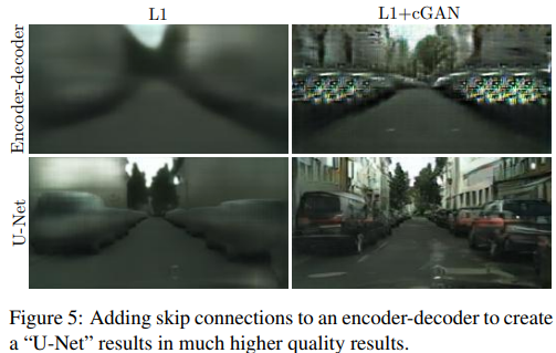 Figure 5: Adding skip connections to an encoder-decoder to create a "U-Net" results in much higher quality results