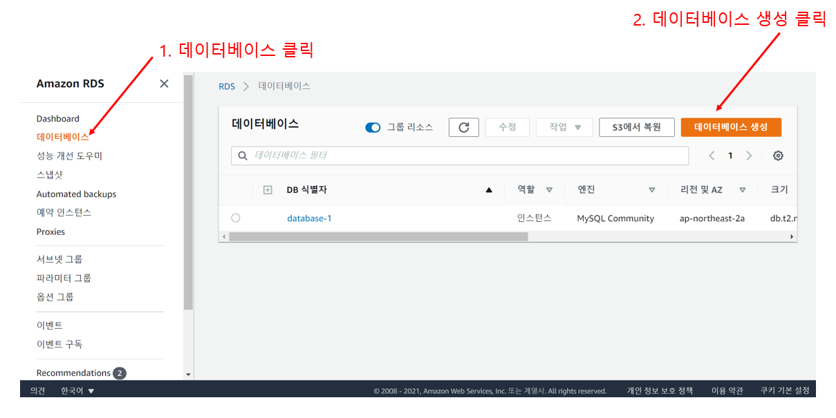 - 생성된 RDS인스턴스를 클릭합니다 .