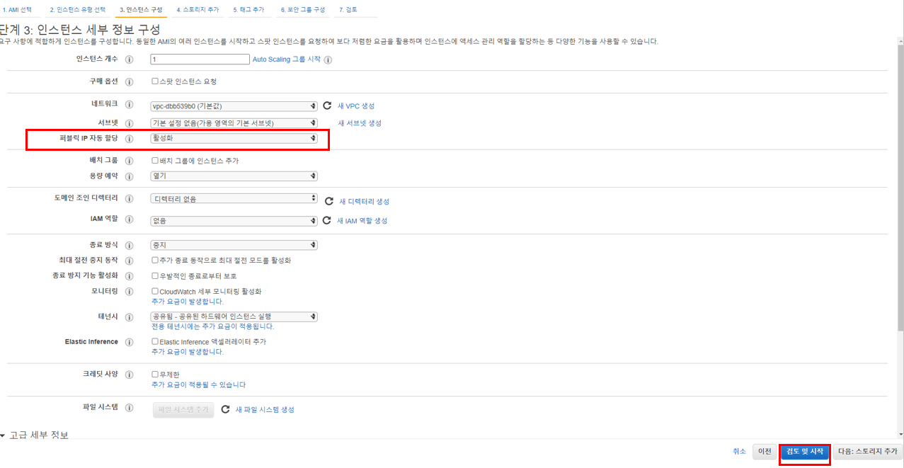 나머지 옵션들은 디폴트 값을 그대로 하고 검토 및 시작 버튼을 클릭합니다.