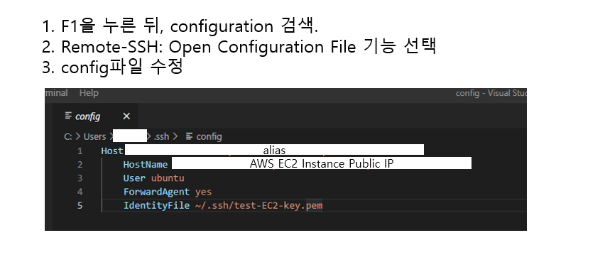 VSCode에서 F1키를 누르고, configuration을 검색한 뒤, Remote-SSH: Open COnfiguration File기능을 선택합니다.