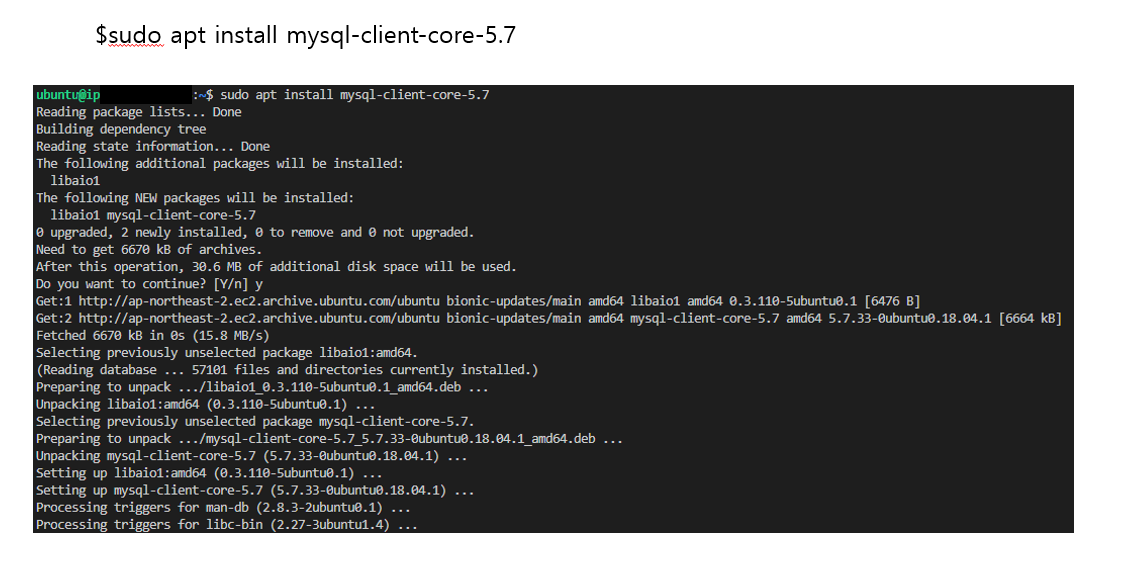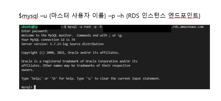 - mysql -u {마스터 사용자 이름} -p -h {RDS 인스턴스 엔드포인트}