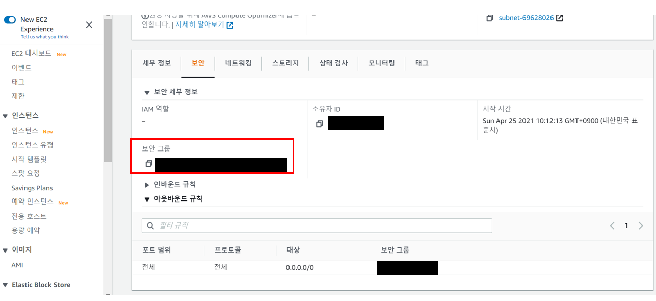 EC2 인스턴스에서 보안그룹을 클릭합니다.
