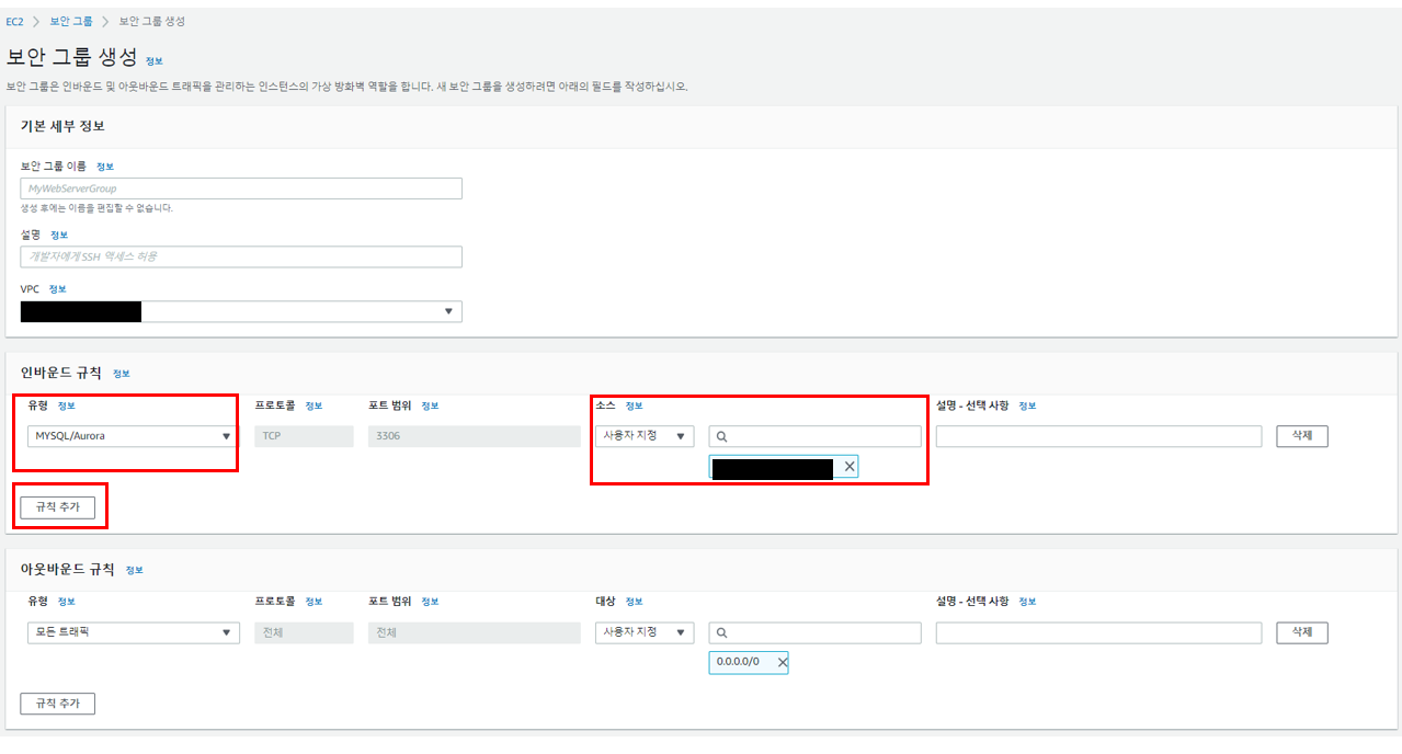 RDS에서 생성한 보안그룹을 선택한 뒤, 인바운드 규칙에서 규칙 추가 버튼을 클릭한 뒤, 다음과 같이 규칙을 추가합니다.