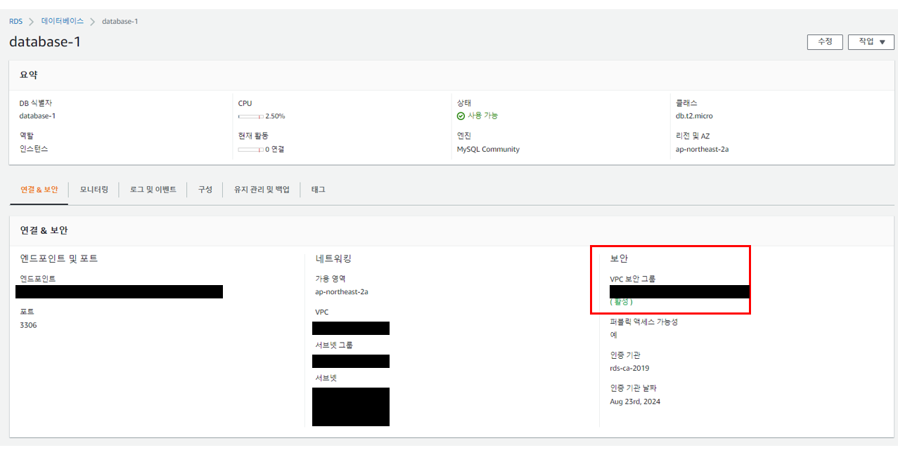 RDS인스턴스페이지에서 VPC 보안 그룹을 클릭합니다.