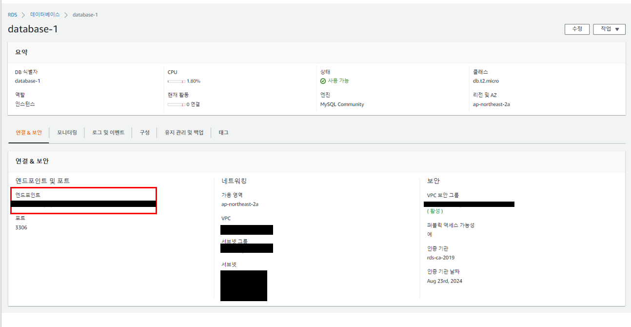 RDS 인스턴스 페이지에서 엔드포인트를 확인합니다.